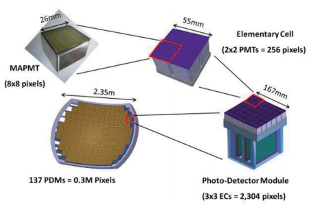 JEM-EUSO detektor je 2.5 metrov teleskop (optick apertra 4.5 m^2) s vysokorchlostnou ultrafialovou (UV v rozsahu vlnovch dok 300-400 nm) kamerou. Pozostva z 5 tisc fotonsobiov s celkovo 300 tisc pixelmi, kad s rozmerom menej ako 3x3 mm. Jeden pixel detektora pokrva na povrchu Zeme oblas so stranou dlhou 560 metrov. Princp fungovania astice UHECR s energiami nad GZK limitom dopadaj na povrch atmosfry Zeme a produkuj v nej spky sekundrneho kozmickho iarenia, ktor excituj molekuly atmosfrickho duska nsledne emitujce UV iarenie s charakteristickmi emisnmi iarami v rozmedz vlnovch dok od 300 do 400 nm. Naprklad astica (protn) s energiou 10^20 eV vytvor v atmosfre spku sekundrneho stle relativistickho kozmickho iarenia, ktor izotrpne pozd svojej trajektrie v atmosfre emituje 10^15 fotnov. Pri pohade z vky 400 km je priestorov uhol teleskopu 3 10^-11 sr o znamen, e na povrch detektora dopadne pribline 100010000 fotnov. Stopu tvoren tmito fotnmi pohybujcu sa atmosfrou rchlosou blzkou rchlosti svetla registruje JEM-EUSO detektor z nzkej orbity Zeme (~400 km) na vekej ploche s vysokm asovm rozlenm. Pri 60 stupovej apertre detektora v takzvanom nadir mde snma na povrchu Zeme oblas s rozlohou 140 tisc kilometrov tvorcovch. Oblas snmkuje 400 tisc krt za sekundu pohybujc sa rchlosou 7 km/s. Celkov apertra JEM-EUSO detektora o rd presiahne apertru experimentu Pierre Auger Observatory, ktor je najvm pozemnm experimetom na meranie UHECR. Pozemn detektory UHECR u dosiahli z hadiska zvovania apertry hranice svojich monost. Logickm krokom na zskanie dostatonej tatistiky UHECR eventov, ktor priamo zavis na apertre detektora je pozorovanie z kozmu. Koncept sledovania UHECR z orbity Zeme vyuvajci zemsk atmosfru ako jeden obrovsk detektor je doteraz nezrealizovanm spsobom skmania UHECR astc. JEM-EUSO experiment je prvm experimentom tohto typu s kapacitou dostanou na vyrieenie otzky pvodu a charakteristk UHECR Fresnelove oovky :: Realizcia irokho zornho poa pri nzkej hmotnosti JEM-EUSO teleskop pouva Fresnelove oovky. Fresnelova oovka je poloploch oovka, ktor m kruhov drky, ktor eliminuj vek hmotnos tandardnch konvektvnych a konkvnych ooviek. Tenkos a ahkos Fresnelovej oovky je nevyhnutnou podmienkou jej vuyitia vo vesmre, priom ponka rovnak optick funkcie ako hrub a ak oovky. JEM-EUSO pouva dve zakriven obojstrann Fresnelove oovky z UV priepustnho plastu a jednu mikromriekov Fresnelovu oovku. Tento dizajn umouje najvyiu innos irokho zornho poa. Vekos trojitej oovky je 2.5 m v priemere, zloen zo stredovej 1.5 m asti a kruhovho povrchu prstencovch ooviek. Detektory ohniskovej plochy :: 5,000 fotonsobiov Ohniskov plocha je zakriven s priemerom 2.26 m. 5000 1-palcovch tvorcovch multiandovch fotonsobiov (PMTs) detektuje svetlo z rznych miest v zemskej atmosfre. Predchdzajce fotonsobie (PMTs) mali obmedzen fotosenzitvnu plochu pribline 45%. JEM-EUSO a Hamamatsu Photonics spolone vyvinuli fotonsobie (PMTs), ktor maj inn plochu 85% |