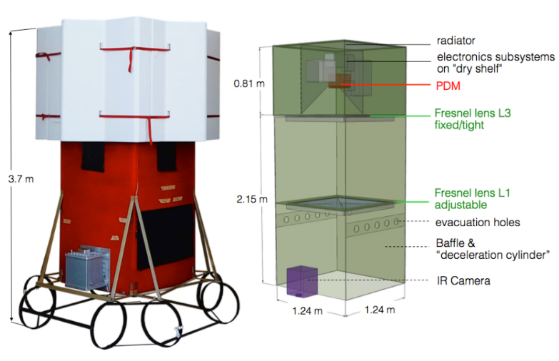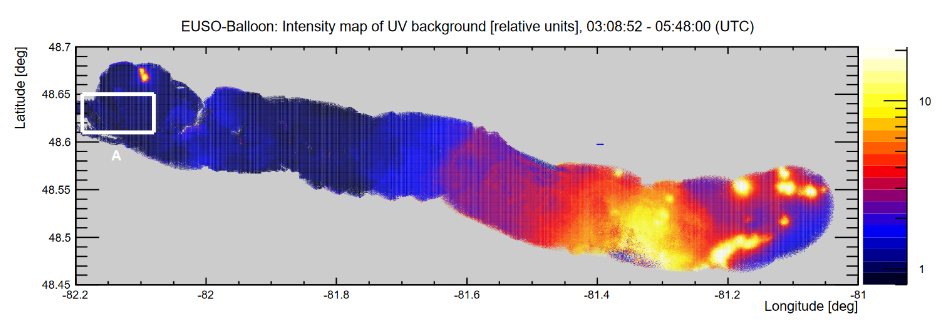 Prvou prpravnou misiou experimentu JEM-EUSO bol let prototypu hlavnho detektora na stratosferickom balne. Misia s nzvom EUSO-Balloon bola realizovan v zkej spoluprci s Franczskou vesmrnou agentrou (CNES) a uskutonila sa poas bezmesanej noci 24. - 25. augusta 2014 so tartom zo stratosferickej balnovej zkladne pri meste Timmins (Ontario, Kanada). Hlavn ciele misie boli: a) demontrcia a testovanie kovch technolgi vyvjanch pre JEM-EUSO experiment b) meranie atmosferickho UV pozadia s relevantnm priestorovm a asovm rozlenm c) prv detekcia simulovanch EAS spok v histrii, zskan zo stratosfry pri pohade smerom k zemi Jednotliv ciele boli spene splnen a hlavn detektor - PDM (Photon Detection Module) s 2 304 vysoko citlivmi pixelmi a s optikou dvoch fresnelovch ooviek s plochou 1 m^2 - zskal poas piatich hodn merania viac ako 10^7 snmok z vky 38 km nad zemskm povrchom. Vaka presnmu zznamu polohy gondoly, s vhou 470 kg, bolo mon zrekontruova mapu UV pozadia pre rzne atmosferick podmienky, ktor poas letu nastali. Tie boli monitorovan samostatnou infraervenou kamerou. Na vytvoren mapy UV pozadia, ktor je prv svojho druhu pre ely detekcie EAS spok, spolupracovalo Oddelenie kozmickej fyziky stavu experimentlnej fyziky, SAV v Koiciach s ISDC Dtovym centrom pre astrofyziku enevskej univerzity (vajiarsko). Vysokorchlostn detektor zaznamenal aj simulovan EAS spky tvoren UV-LED, Xe a laserovmi zbleskmi zo zariaden umiestnench na helikoptre, ktor dve hodiny krila v zornom poli detektora. Zskan poznatky z testu technolgi, ako aj z analzy dt, sa vyuvaj v alch prekurzorch EUSO-TA, EUSO-SPB a Mini-EUSO, aby sa tak mohli vylepi a vyui v hlavnom experimente JEM-EUSO. ![]() Obr. 1: Fotografia (vavo) a nrt (vpravo) gondoly s detektormi misie EUSO-Balloon. (Ballmoos, P. V. for JEM-EUSO collaboration: 2015, The EUSO-Balloon mission, 34nd International Cosmic Ray Conference, The Hague, Netherlands) ![]() Obr. 2: Zrekontruovan mapa UV pozadia. Intenzvne svetlo na pravej strane je tvoren umelm osvetlenm v meste Timmins a priahlch industrilnych znach. Regin oznaen psmenom A znzoruje miesto s najlepmi podmienkami pre detekciu EAS spok. Svetlo z tohoto reginu je tvoren iarenm hornej atmosfry Zeme (airglow), svetlom hviezd a zodiaklnym svetlom, ktor sa odra od atmosfry a zemskho povrchu. (Mackovjak, S., Neronov, A., Bobk, P., Puti, M. et al. for JEM-EUSO collaboration: 2015, Night Time Measurement of the UV Background by EUSO-Balloon, 34nd International Cosmic Ray Conference, The Hague, Netherlands) ![]() Obr. 3: Simulovan EAS spka pomocou laserovho zblesku. Farby znzoruj relatvnu zmenu v intenzite. (Eser, J., Adams, J. et al. for JEM-EUSO collaboration: 2015, EUSO-Balloon: Observation and Measurement of Tracks from a laser in a Helicopter 34nd International Cosmic Ray Conference, The Hague, Netherland) |