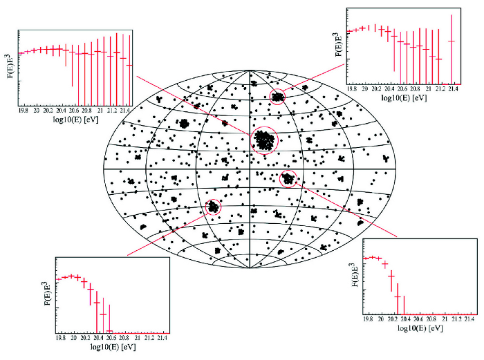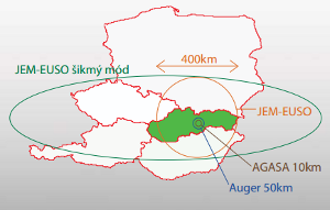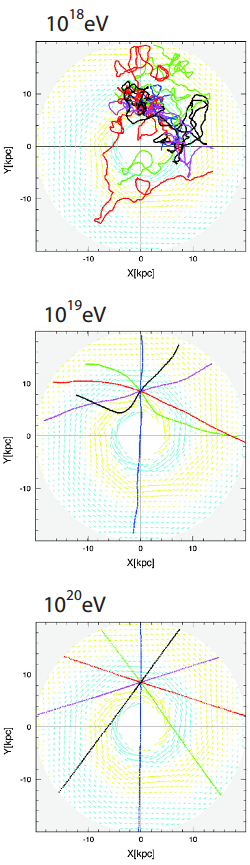 ![]() Ilustrcia skokovitho nrastu apertry experimentu JEM-EUSO voi pozemnm experimentom ![]() Trajektrie nabitch astc nzkych energi s ohban magnetickm poom, no astice s energiami nad 10^20 eV sa pohybuj po takmer priamoiarej trajektri a tak je zachovvan informcia o smere ich pvodu. |